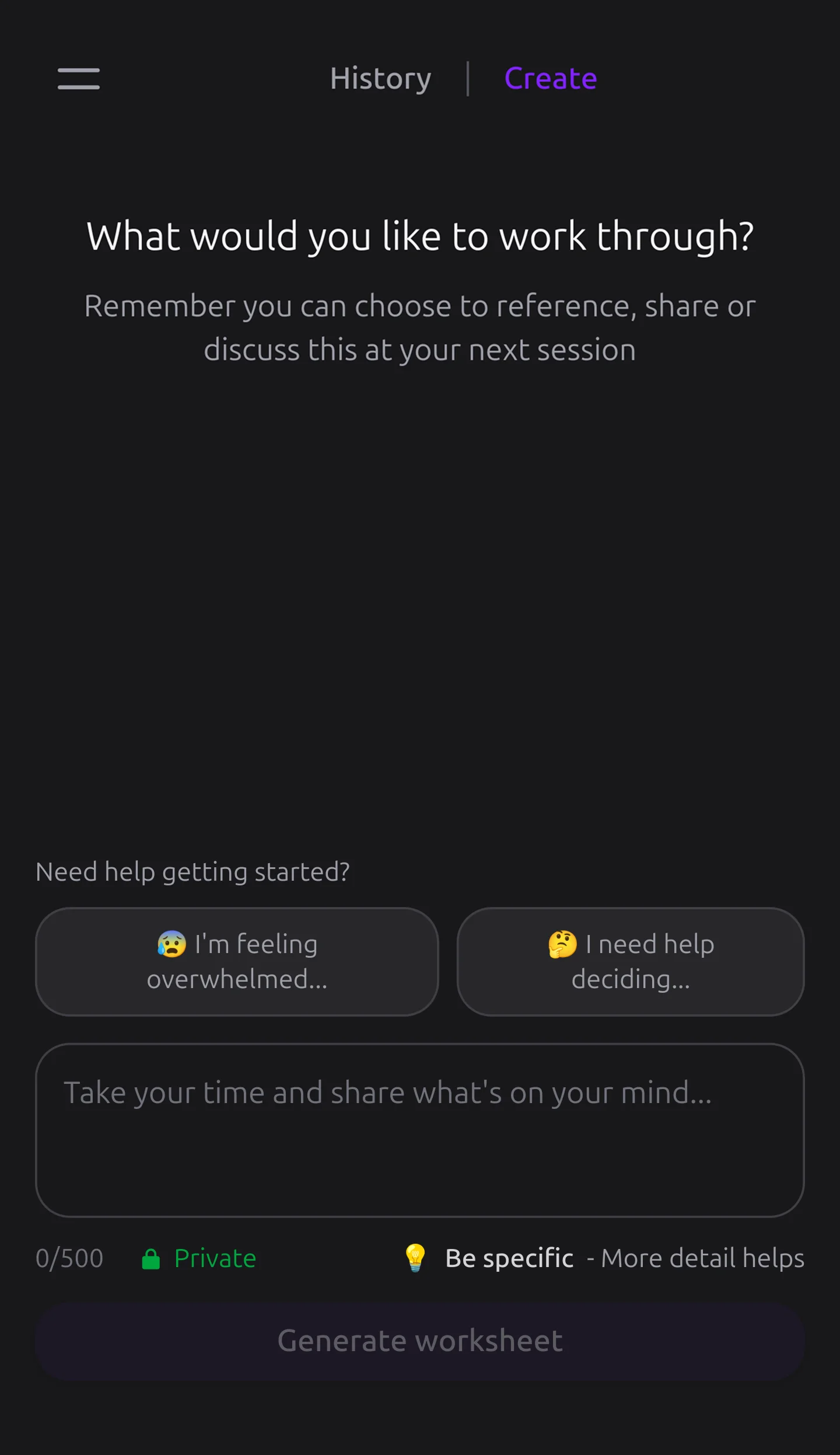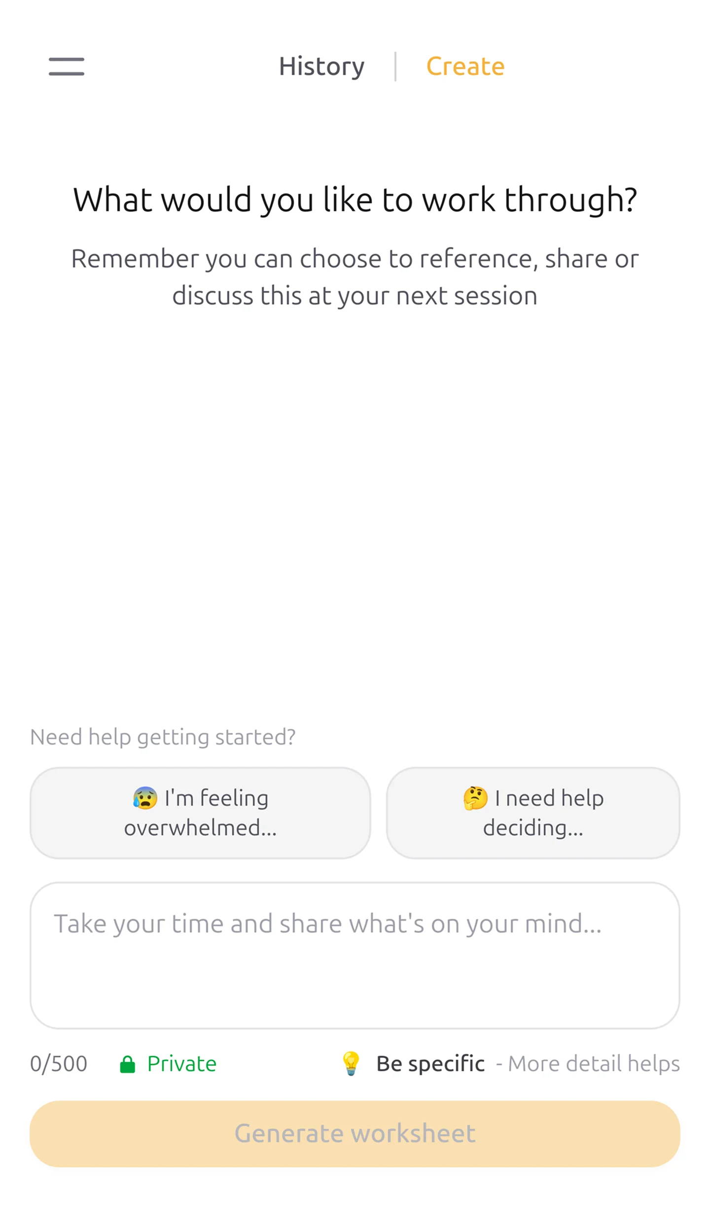 Every therapist gets a practice studio where you can test worksheet generation yourself before using it with clients. Generate thought records, try pros & cons worksheets, and evaluate if the tone and structure align with your therapeutic approach. You review what clients share with you, and you remain the clinical authority.